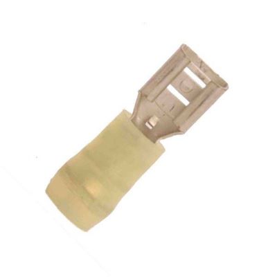 Double crimp nylon insulated push on terminals are quick connect wire terminals that come in both male and female versions for wire sizes ranging from 22 gauge to 10 gauge. Double crimp design crimps the wire and the insulation for extra pull strength and strain relief. Nylon insulating maternal won't deform from crimping and will hold up to higher temperatures than standard vinyl (PVC) insulation. The partially insulated nylon material is color coded based on the wire size. Double crimp nylon push on terminals are rated to 600 volts and temperatures up to 221°F (105°C). Quick connect push on size is 1/4 inch. These are higher performance push on terminals that are suitable for use in automotive and marine electrical systems, as well as commercial and industrial electrical applications.