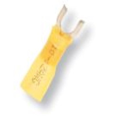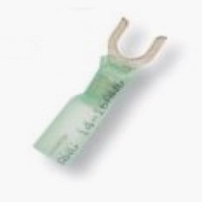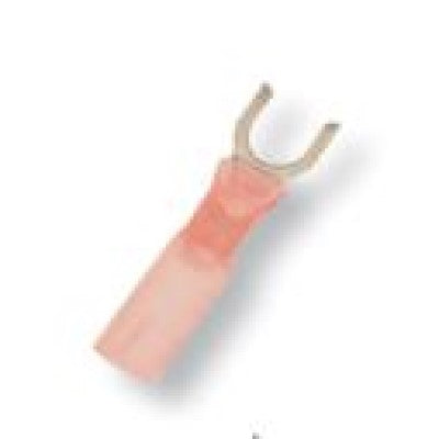 Heat shrink insulated spade terminals, also called fork terminals, are perfect for marine and automotive use. The terminal design allows for easy connection and removal from screw-type connections. Heat shrink is adhesive-lined and color-coded to the industry standard wire range. The terminal will seal out water, and protect the connection from corrosion. The translucent, gauge-printed heat shrink allows for easy visual inspection of the crimp. Has a greater pull strength when compared to vinyl or nylon. Rated to 600 volts.