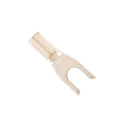 Non-insulated spade/fork terminals for wire sizes ranging from 22 gauge to 10 gauge. Also known as fork terminals. Available in the following stud/fork sizes: #6, #8, and #10. Made from tin plated copper. Temperature rating up to 221°F (105°C). Voltage rating up to 600 volts. Can be crimped or soldered. Small packs and bulk packaging available.