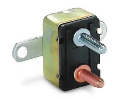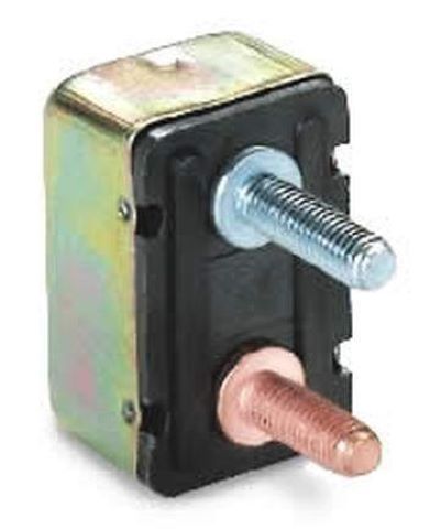 Auto reset circuit breakers are commonly used to protect electrical wiring and components in 12 volt vehicles from short circuits and excessive current draw. They have been reliably used for decades as a replacement to costlier fuses and fusible link wires. Connections to the circuit breaker is made using the two #8-32 studs protruding from the face. One connection stud is for your power connection, and is labeled 'BAT'. The other stud connection is labeled 'AUX', which is where you attach the electrical device you want to protect. The base of the short stop breaker comes in two mounting feet configurations, and also is available without mounting feet. Auto reset circuit breakers operate in the following way - When a short circuit to ground, or too much current flows through the breaker, the contacts inside heat up and separate, interrupting the flow of electricity and protecting your circuit. When the short stop breaker cools, the electrical contacts inside will re-connect, thereby automatically resetting the circuit breaker. If the short circuit or over current condition still exists, the breaker will trip again and repeat the cycle. One of the most common circuit breakers found in automobiles, trucks, boats, equipment, and RV's.